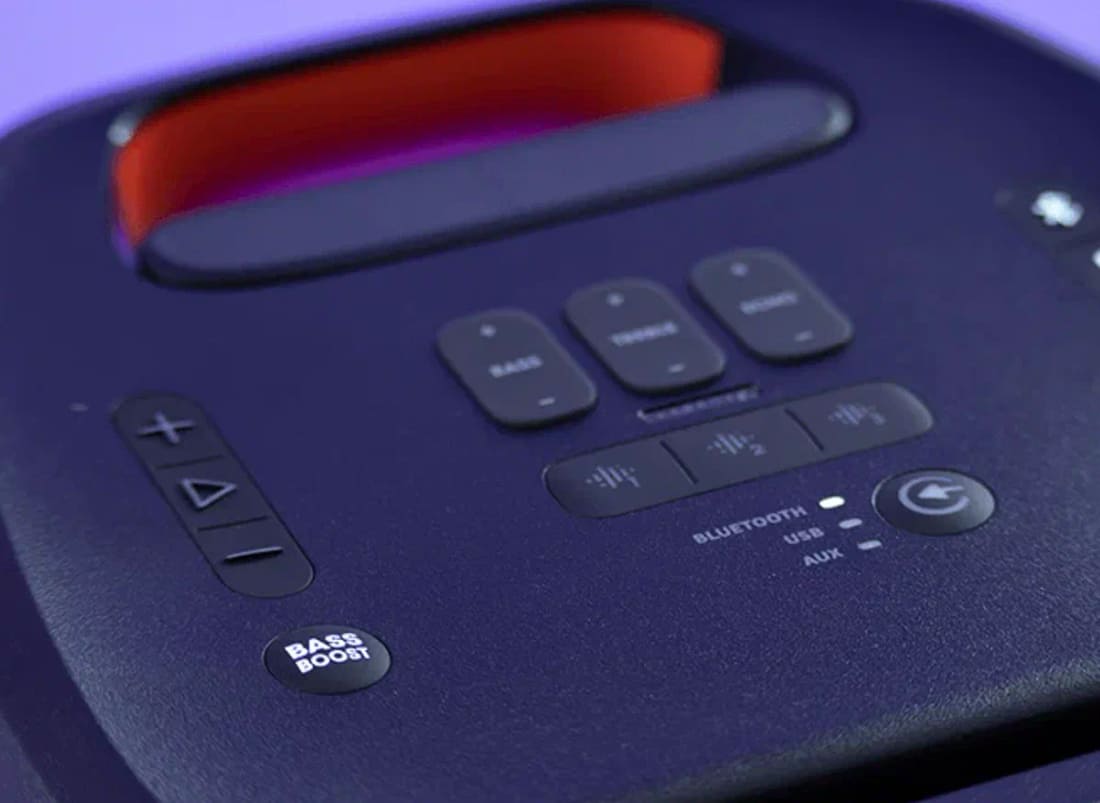 Управление JBL PartyBox 310 осуществляется с помощью 17 крупных кнопок, расположенных на верхней панели устройства. Также имеется разъём для сетевого шнура и гнездо питания, защищённые от брызг воды (IPX4).