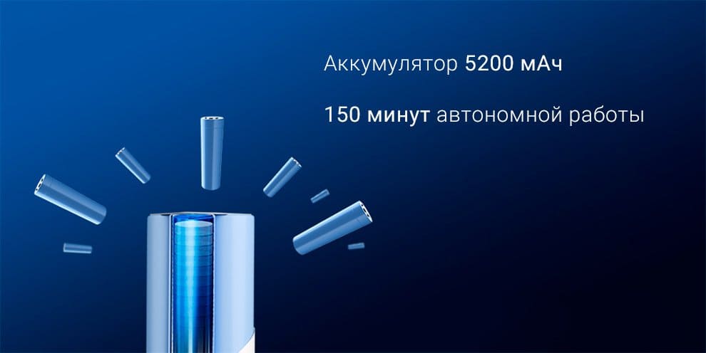 Емкость аккумулятора достигает 5200 мАч, при этом функционирует специальная система управления батареей, которая сокращает потребление энергии. На одном заряде устройство отработает около 150 минут.