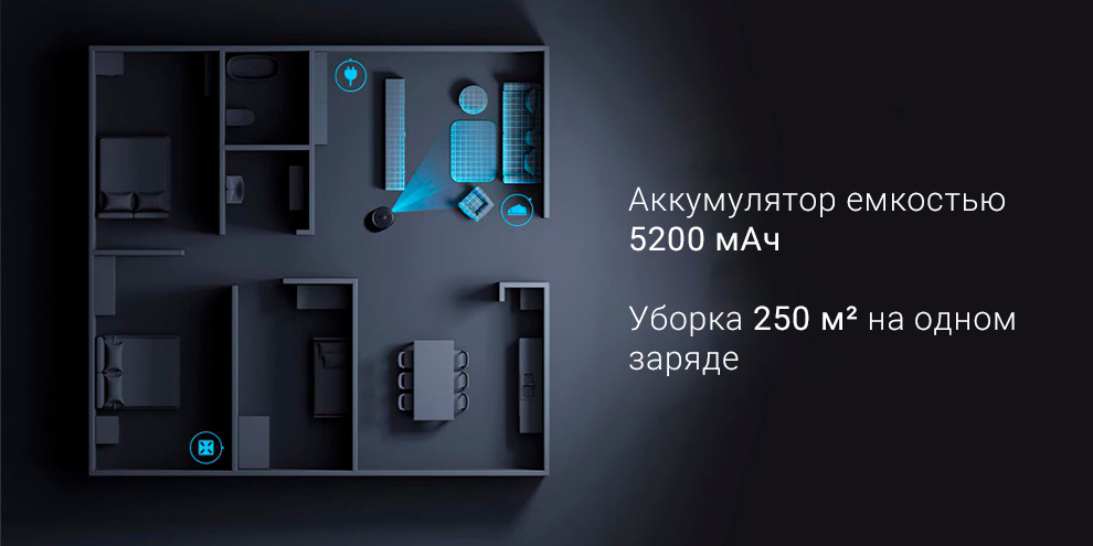 Пылесос получил большой аккумулятор, емкость которого составляет 5200 мАч. На одном заряде он может убрать помещение площадью 250 м². После уборки девайс автоматически возвращается на зарядную базу.