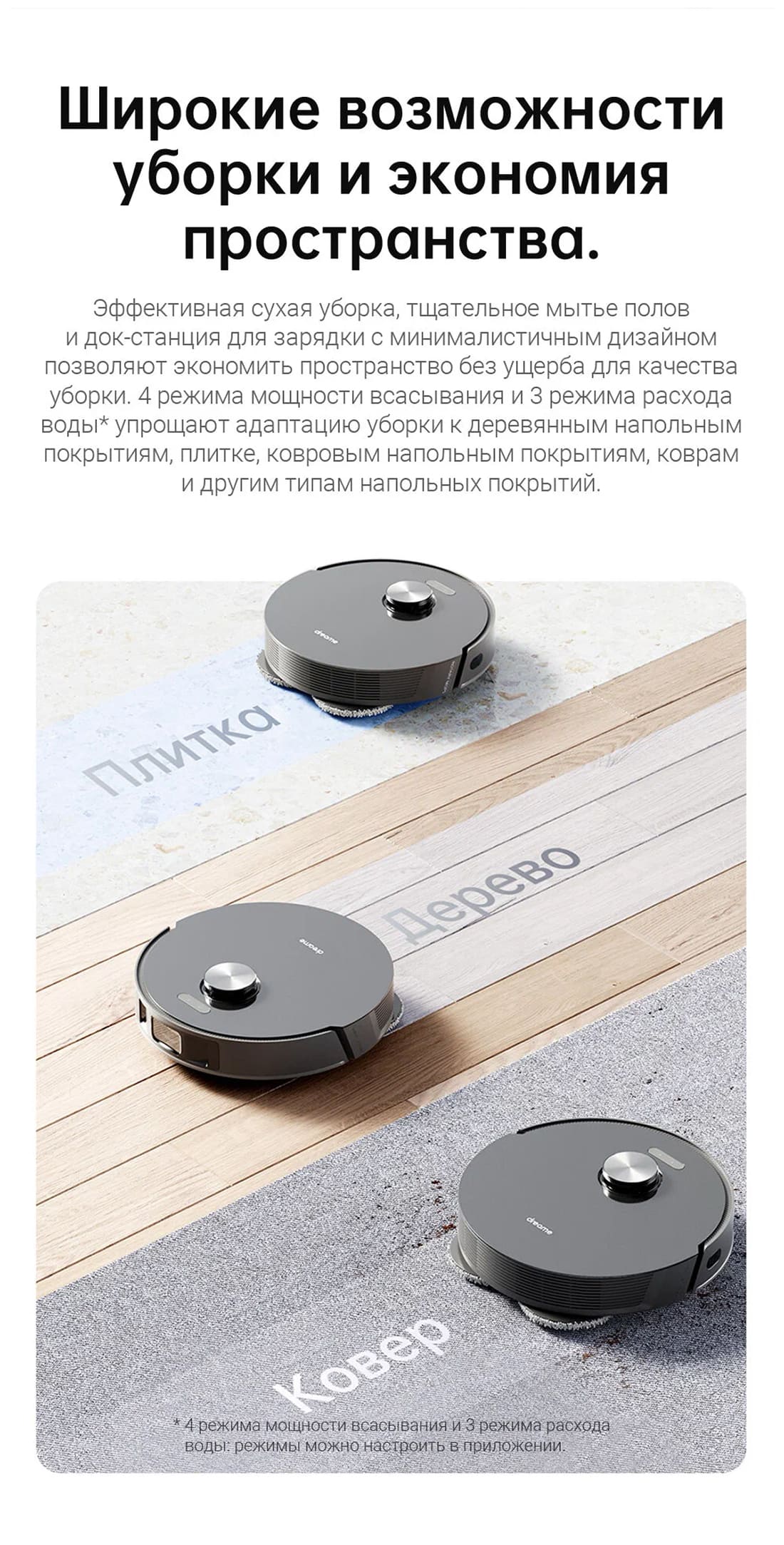 Dreame L10s Pro оснащен мощным аккумулятором ёмкостью 5200 мАч, который позволяет ему работать до 160 минут в автономном режиме. А функция сухой и влажной уборки дает возможность еще более эффективно бороться со всеми видами загрязнений.