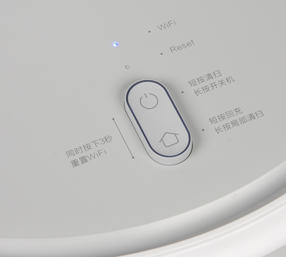 Пылесосом можно управлять при помощи кнопок, расположенных на корпусе. Их две — кнопка выключения/включения и кнопка возвращения на базу для подзарядки. На корпусе также есть индикатор зарядки пылесоса.