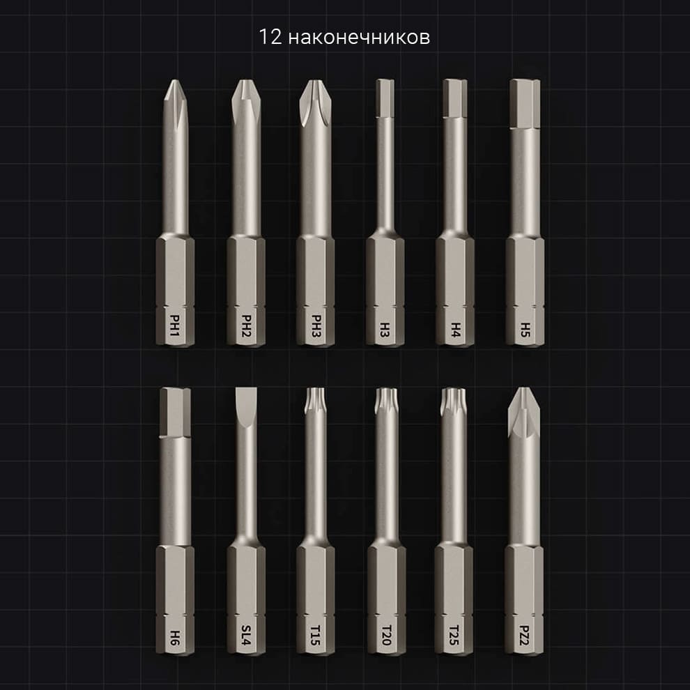 Портативная электрическая отвертка Xiaomi имеет 12 наконечников, которые подойдут для использования в любой сфере. Емкость аккумулятора достигает 1500 мАч, скорость магнитоэлектрического редуктора составляет 220 об/мин. Есть возможность блокировки кнопки питания и подсветки LED. Поставляется вместе со специальным блоком хранения, с помощью которого гаджет легко переносить.
