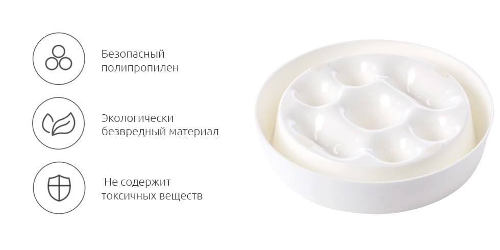 Животные любят есть быстро, что приводит к возникновению дисфагии и рвотных позывов. Особая конструкция миски заставляет их «добывать» себе пищу, тем самым замедляя скорость кормления. Питомец воспринимает это как игру и радуется обеду еще больше. А Вы знаете, что он защищен от проблем с пищеварительным трактом.