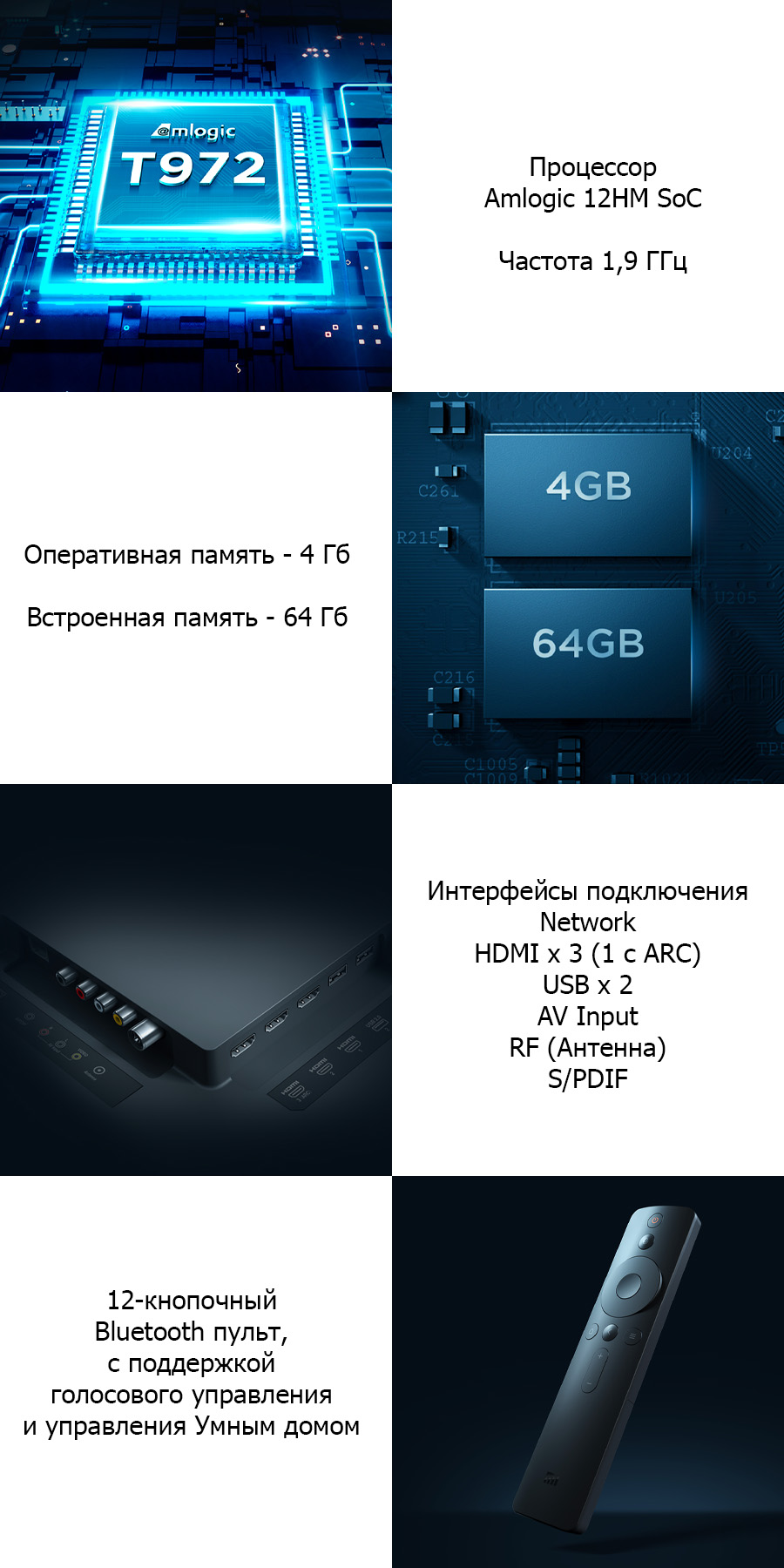 Телевизор Xiaomi Mi TV 5 Pro QLED оснащен высокопроизводительным процессором Amlogic T972 c низким энергопотреблением. Частота составляет 1,9 ГГц. Большой объем оперативной и встроенной памяти. Большое количество интерфейсов для подключения различных устройств. В комплекте идет 12-кнопочный Bluetooth пульт, поддерживающий голосовое управление и управление Умным домом.